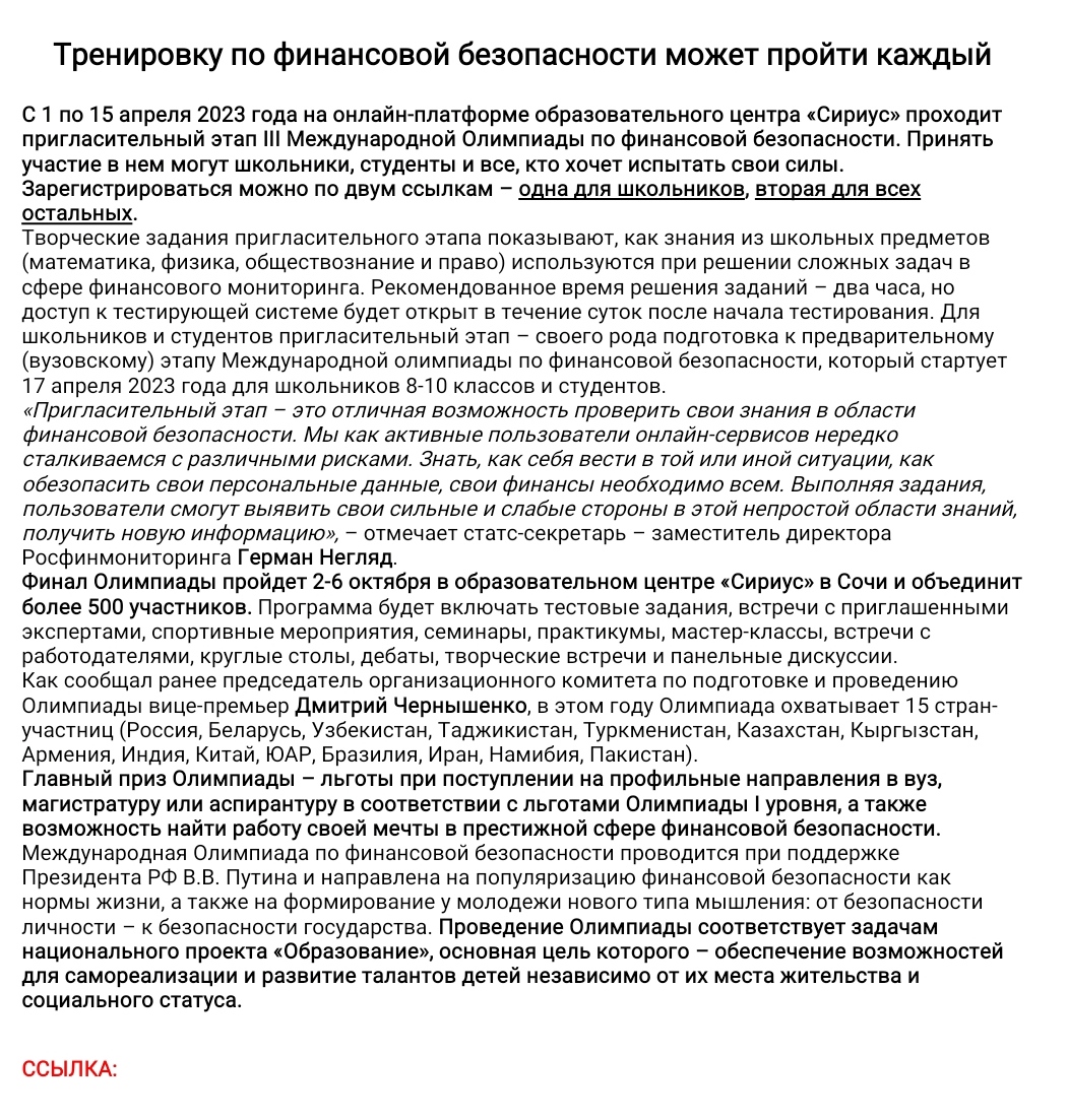 С 1 по 15 апреля 2023 года на онлайн-платформе образовательного центра «Сириус» проходит пригласительный этап III Международной Олимпиады по финансовой безопасности. Принять участие в нем могут школьники, студенты и все, кто хочет испытать свои силы. Зарегистрироваться можно по двум ссылкам – одна для школьников, вторая для всех остальных. Творческие задания пригласительного этапа показывают, как знания из школьных предметов (математика, физика, обществознание и право) используются при решении сложных задач в сфере финансового мониторинга. Рекомендованное время решения заданий – два часа, но доступ к тестирующей системе будет открыт в течение суток после начала тестирования. Для школьников и студентов пригласительный этап – своего рода подготовка к предварительному (вузовскому) этапу Международной олимпиады по финансовой безопасности, который стартует 17 апреля 2023 года для школьников 8-10 классов и студентов. «Пригласительный этап – это отличная возможность проверить свои знания в области финансовой безопасности. Мы как активные пользователи онлайн-сервисов нередко сталкиваемся с различными рисками. Знать, как себя вести в той или иной ситуации, как обезопасить свои персональные данные, свои финансы необходимо всем. Выполняя задания, пользователи смогут выявить свои сильные и слабые стороны в этой непростой области знаний, получить новую информацию», – отмечает статс-секретарь – заместитель директора Росфинмониторинга Герман Негляд. Финал Олимпиады пройдет 2-6 октября в образовательном центре «Сириус» в Сочи и объединит более 500 участников. Программа будет включать тестовые задания, встречи с приглашенными экспертами, спортивные мероприятия, семинары, практикумы, мастер-классы, встречи с работодателями, круглые столы, дебаты, творческие встречи и панельные дискуссии. Как сообщал ранее председатель организационного комитета по подготовке и проведению Олимпиады вице-премьер Дмитрий Чернышенко, в этом году Олимпиада охватывает 15 стран-участниц (Россия, Беларусь, Узбекистан, Таджикистан, Туркменистан, Казахстан, Кыргызстан, Армения, Индия, Китай, ЮАР, Бразилия, Иран, Намибия, Пакистан). Главный приз Олимпиады – льготы при поступлении на профильные направления в вуз, магистратуру или аспирантуру в соответствии с льготами Олимпиады I уровня, а также возможность найти работу своей мечты в престижной сфере финансовой безопасности. Международная Олимпиада по финансовой безопасности проводится при поддержке Президента РФ В.В. Путина и направлена на популяризацию финансовой безопасности как нормы жизни, а также на формирование у молодежи нового типа мышления: от безопасности личности – к безопасности государства. Проведение Олимпиады соответствует задачам национального проекта «Образование», основная цель которого – обеспечение возможностей для самореализации и развитие талантов детей независимо от их места жительства и социального статуса.