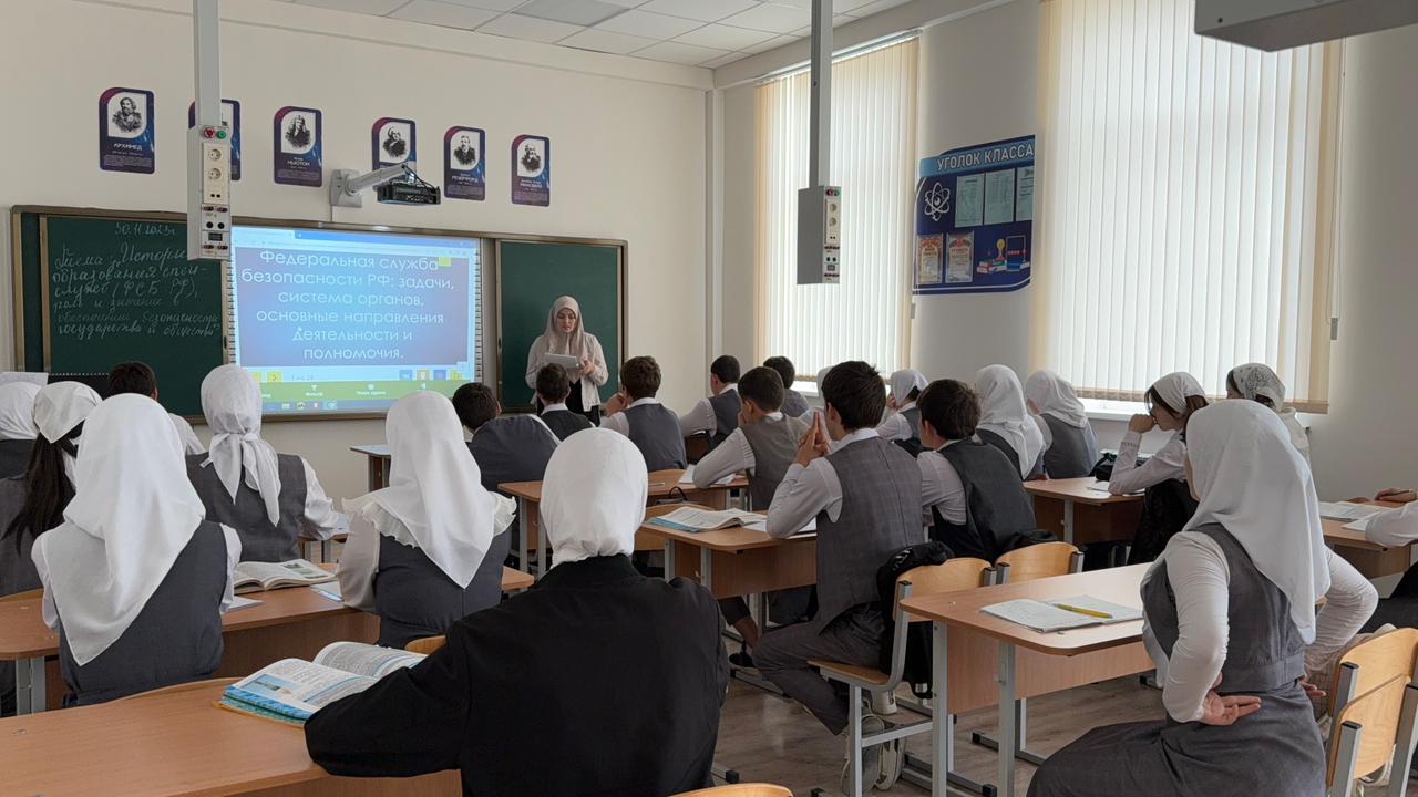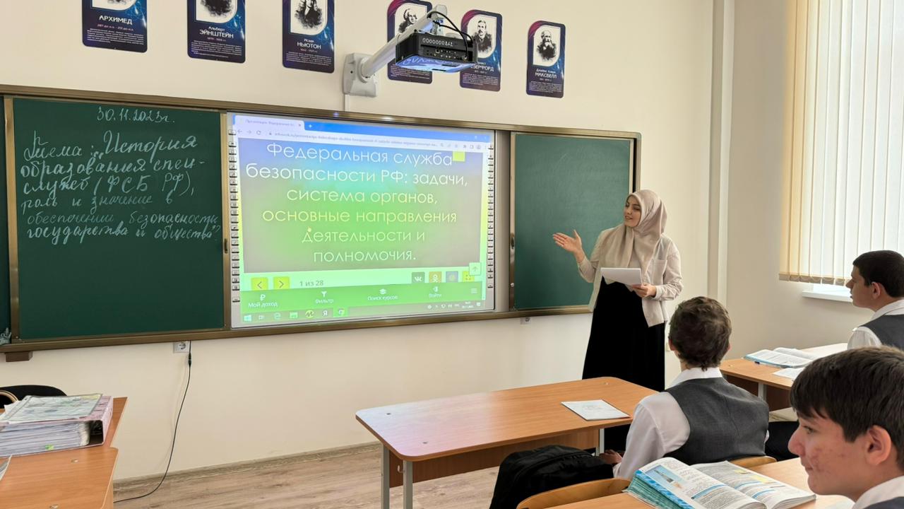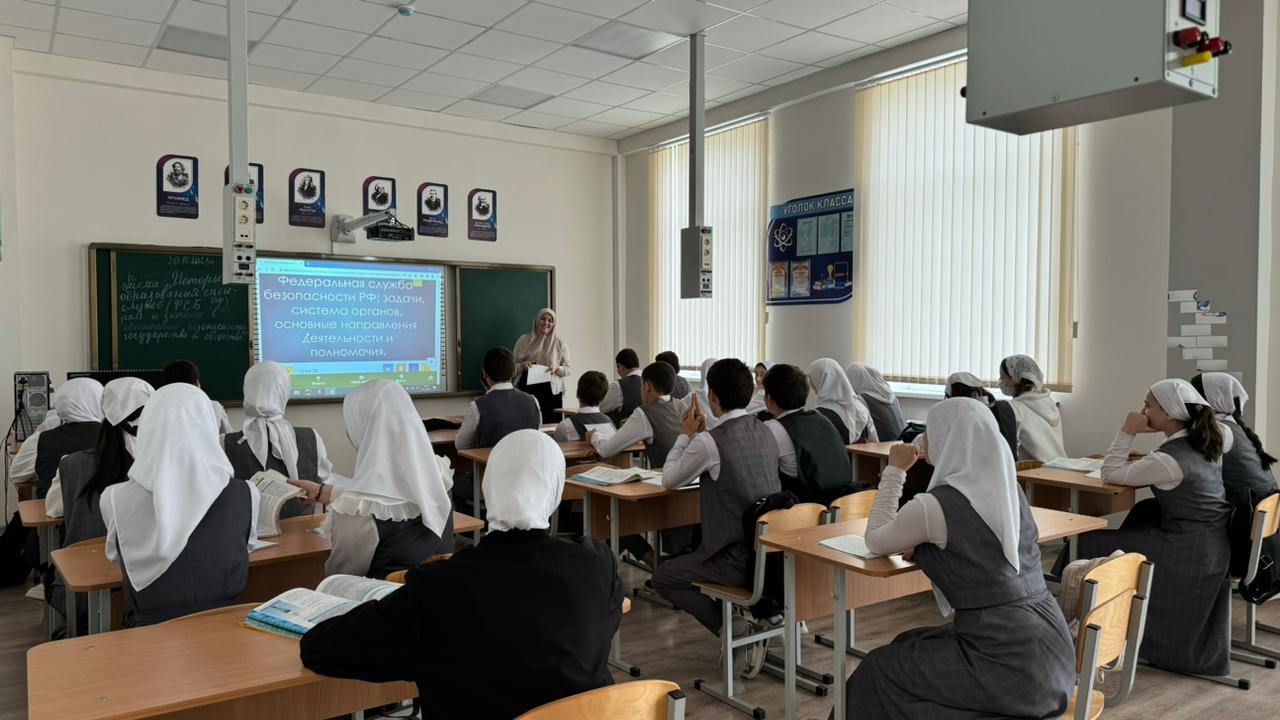 30.11.2023Отделом в Шалинском районе УФСБ России по Чеченской Республике совместно с МУ «Отдел образования Шалинского муниципального района Чеченской Республики» проведено профилактическое мероприятие в МБОУ "СОШ "Территория знаний" с.Дуба-Юрт" на тему: «История образования спецслужб (ФСБ РФ), роль и значение в обеспечении безопасности государства и общества».
